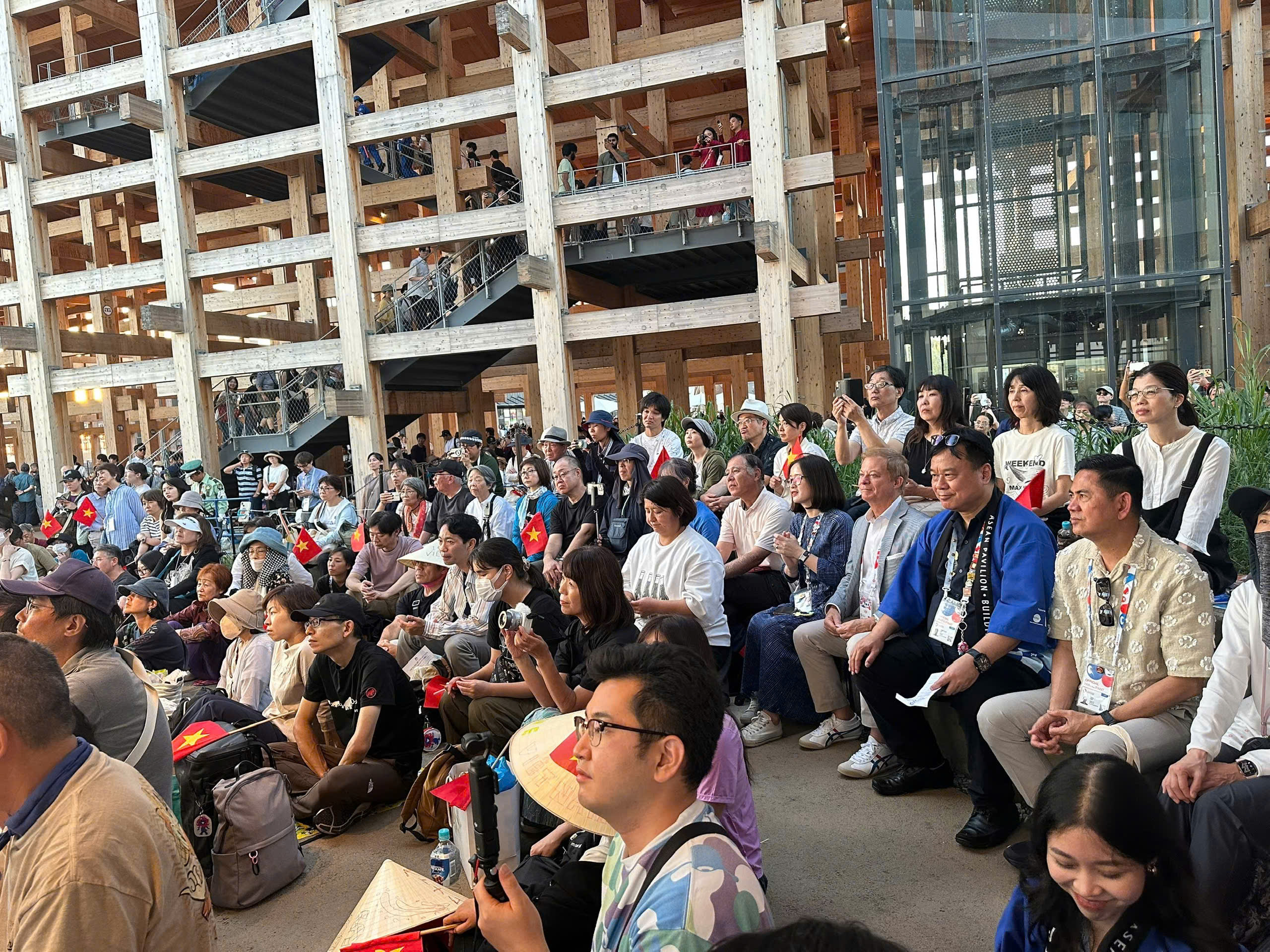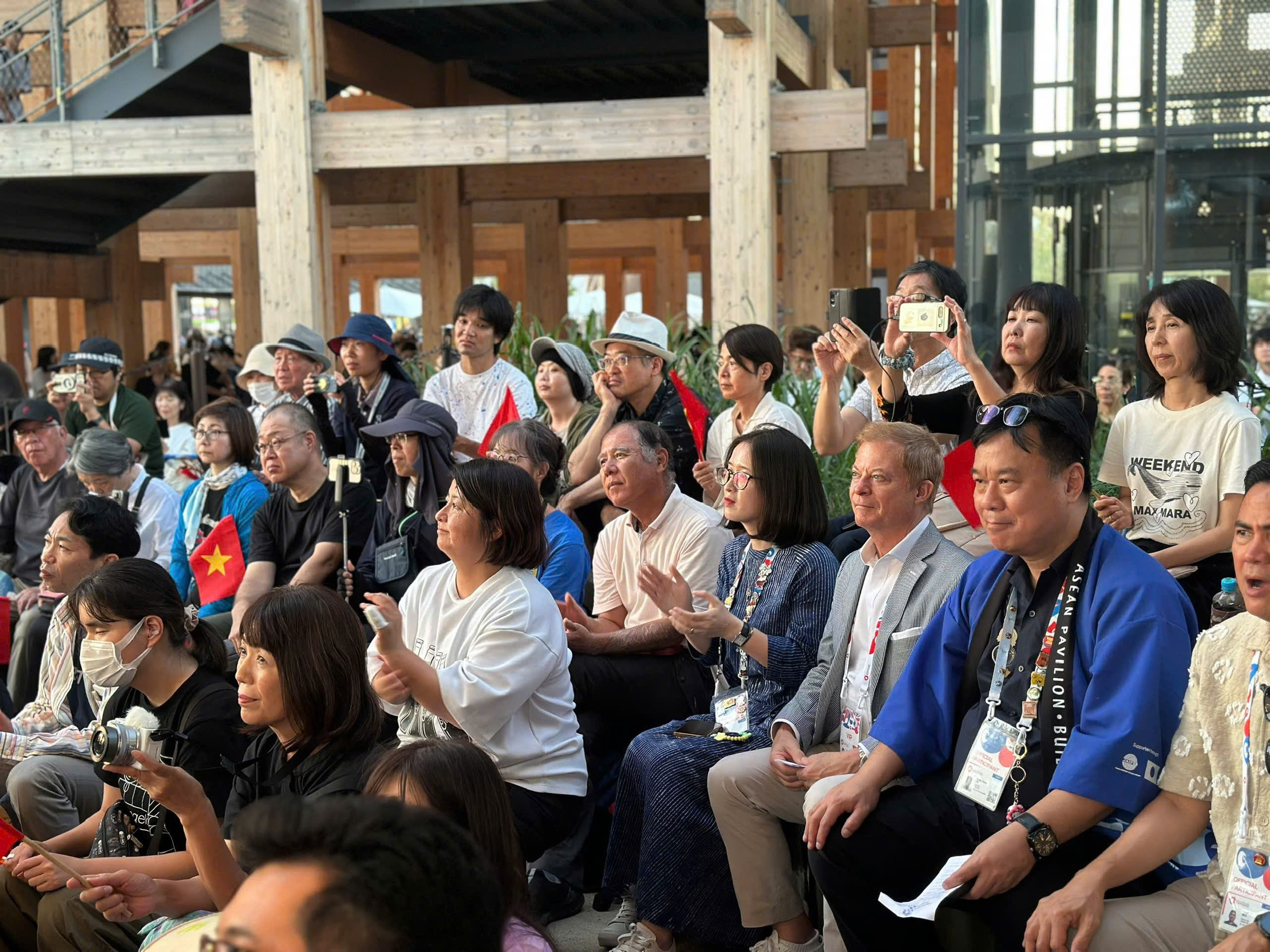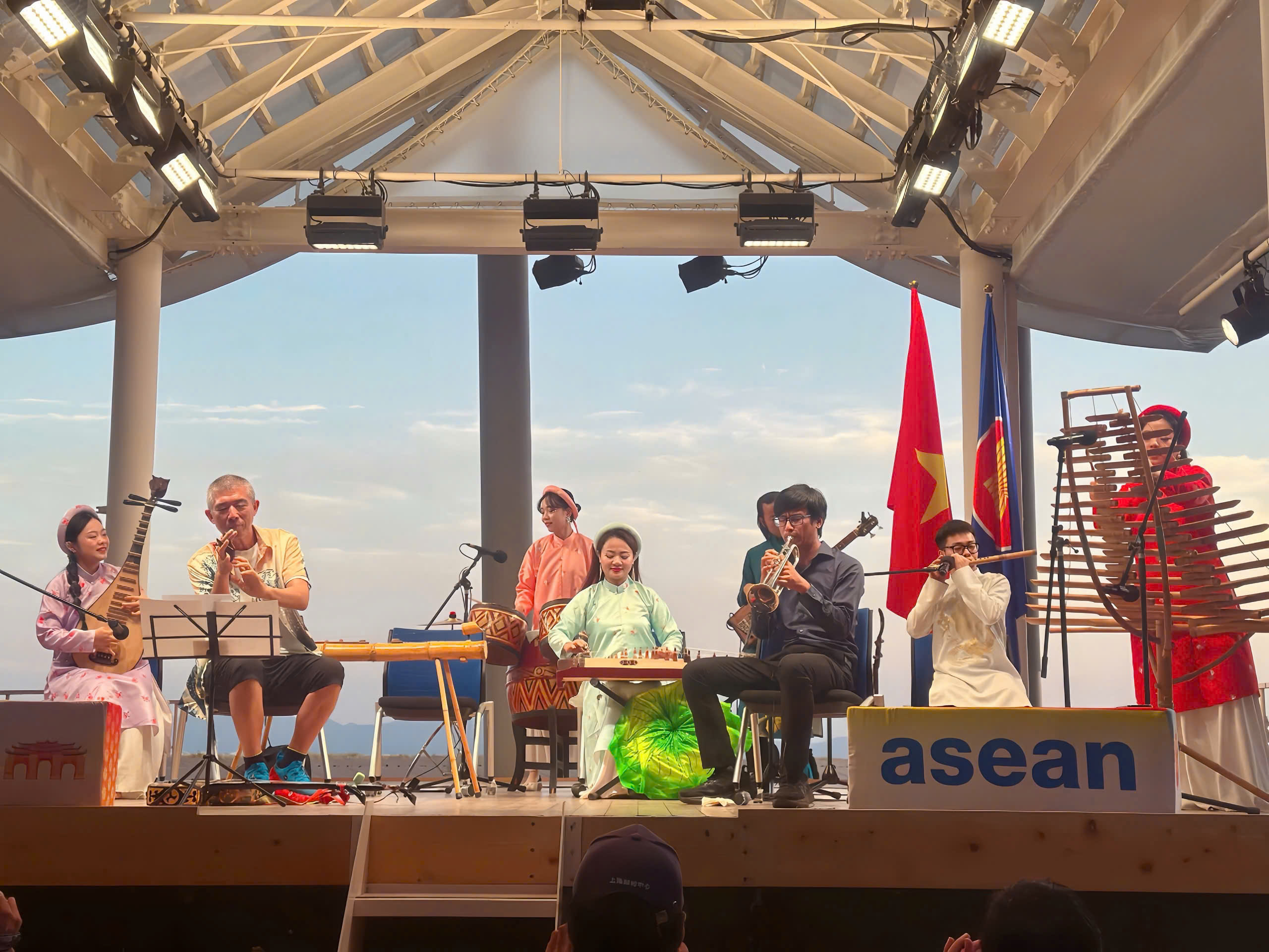 Dưới ánh hoàng hôn bên bờ biển tại hòn đảo Yumeshima, những giai điệu dân ca truyền thống của Việt Nam và Nhật Bản như "Trống cơm", "Bèo dạt mây trôi", "Chuồn chuồn đỏ" ngân lên qua những nhạc cụ tre nứa truyền thống của Việt Nam và cây đàn sanshin Nhật Bản của nghệ sĩ Masaichi Wanibuchi tạo nên một không gian âm nhạc lãng mạn, sâu lắng tại EXPO, làm xiêu lòng khán giả trong nước và quốc tế. Đặc biệt, nghệ sĩ trumpet người Mỹ gốc Việt Austin Dinh Alcancia, với niềm đam mê cháy bỏng với nhạc Trịnh, anh đã mang đến phần trình diễn độc tấu cực kỳ cảm xúc qua ca khúc "Diễm xưa" của nhạc sĩ Trịnh Công Sơn.