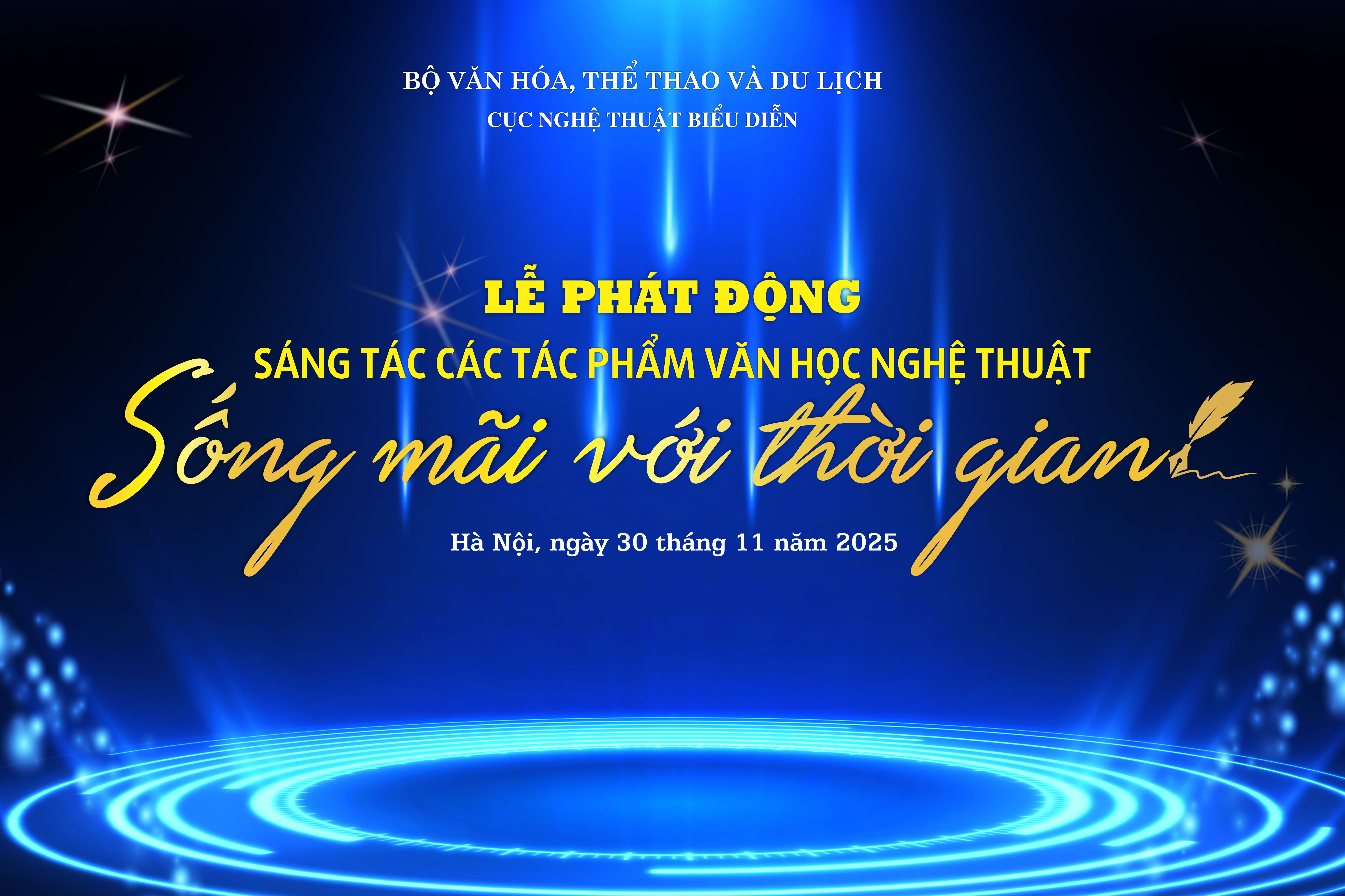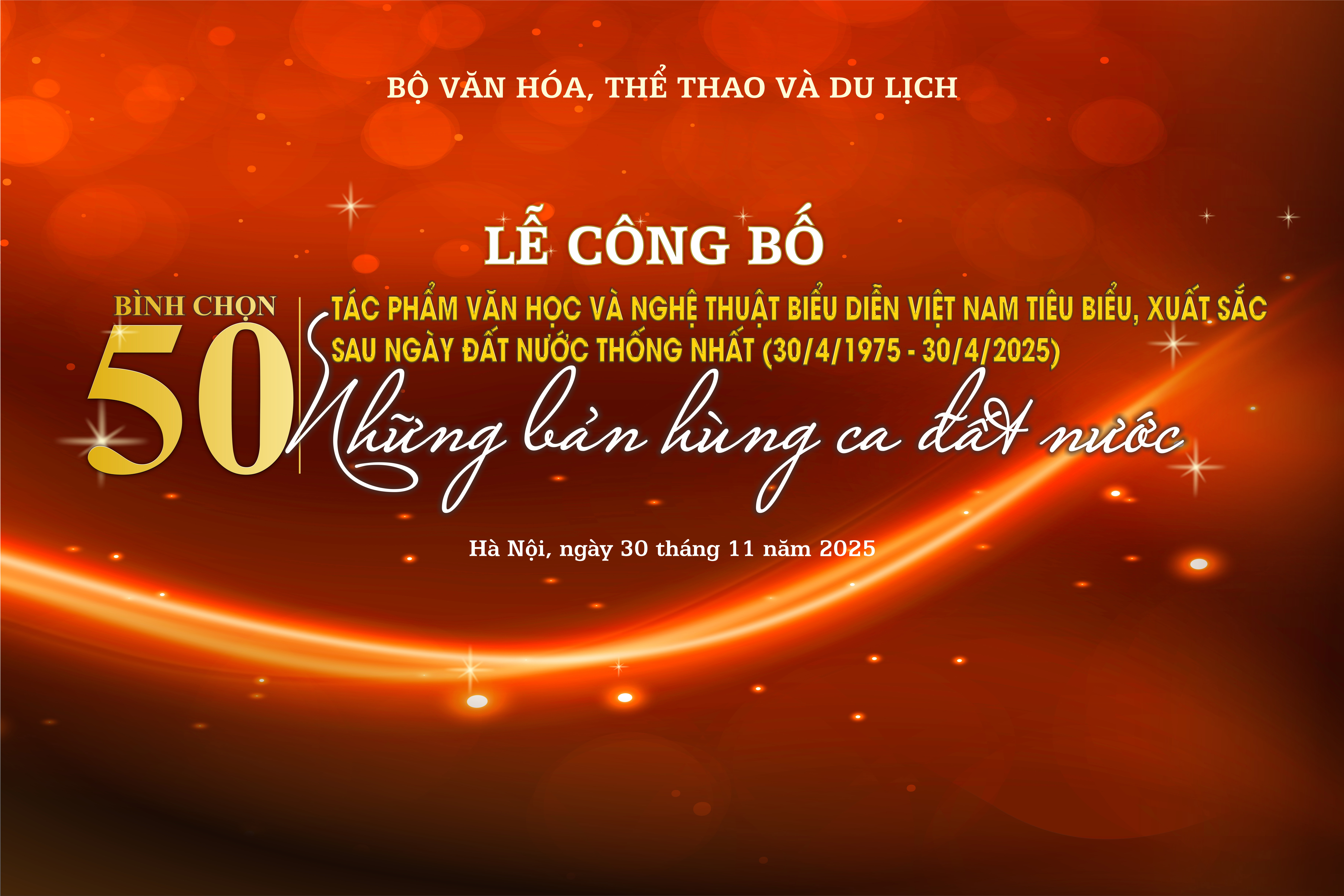 Ngày 30/11/2025, tại Hà Nội - Bộ Văn hóa, Thể thao và Du lịch giao Cục Nghệ thuật biểu diễn phối hợp với các đơn vị liên quan tổ chức sự kiện đặc biệt: Công bố bình chọn 50 tác phẩm văn học, nghệ thuật biểu diễn Việt Nam tiêu biểu, xuất sắc sau ngày đất nước thống nhất (1975 - 2025) đồng thời Phát động sáng tác các tác phẩm văn học nghệ thuật “Sống mãi với thời gian” giai đoạn 2026 - 2030 hướng tới 100 năm Ngày thành lập Đảng Cộng sản Việt Nam (1930 - 2030) và 85 năm Ngày Quốc khánh nước CHXHCN Việt Nam (1945 - 2030).